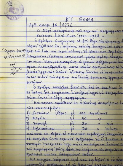 Χειρόγραφα έγγραφα όπου καταγράφεται η συνολική γεωργική παραγωγή της Δονούσας με το ονοματεπώνυμο του παραγωγού, την προβλεπόμενη παραγωγή, τις εκτάσεις, το είδος και τις ποσότητες της συγκομιδής του. Ιδιαίτερο ενδιαφέρον παρουσιάζουν οι πίνακες με τη γεωργική παραγωγή την περίοδο της Κατοχής.