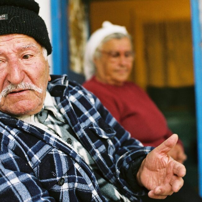 Δημ: Και η πρώτη τηλεόραση ήρθε με μηχανή, με βεζινομηχανή. Την έφερε ένας γαμπρός μου, μια του πατέρα του και μια του πατέρα μου. Δύο τηλεοράσεις, μια ήταν από δω την πλευρά και η άλλη ήταν απέναντι. Με βεζινομηχανή. Και τότες μάλιστα ήταν ο Άγνωστος Πόλεμος, ένα έργο τότες, το σήριαλ εκείνο και τρέχαν όσοι… οι μισοί… αλλά οι περισσότεροι ερχόταν σε μας, ήταν πιο κοντά εδώ. Γέμιζε το σπίτι μέσα, για να δούνε τον Άγνωστο Πόλεμο. Αυτό ήταν μέσα στο εξήντα τόσο, τη δεκαετία του `60 βέβαια.